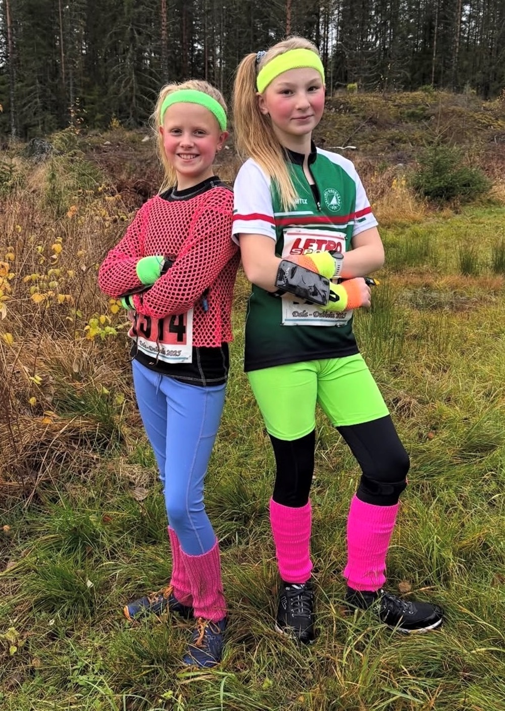 Fanny och Ellen, lätta att se i skogen på söndagens patrullorientering.